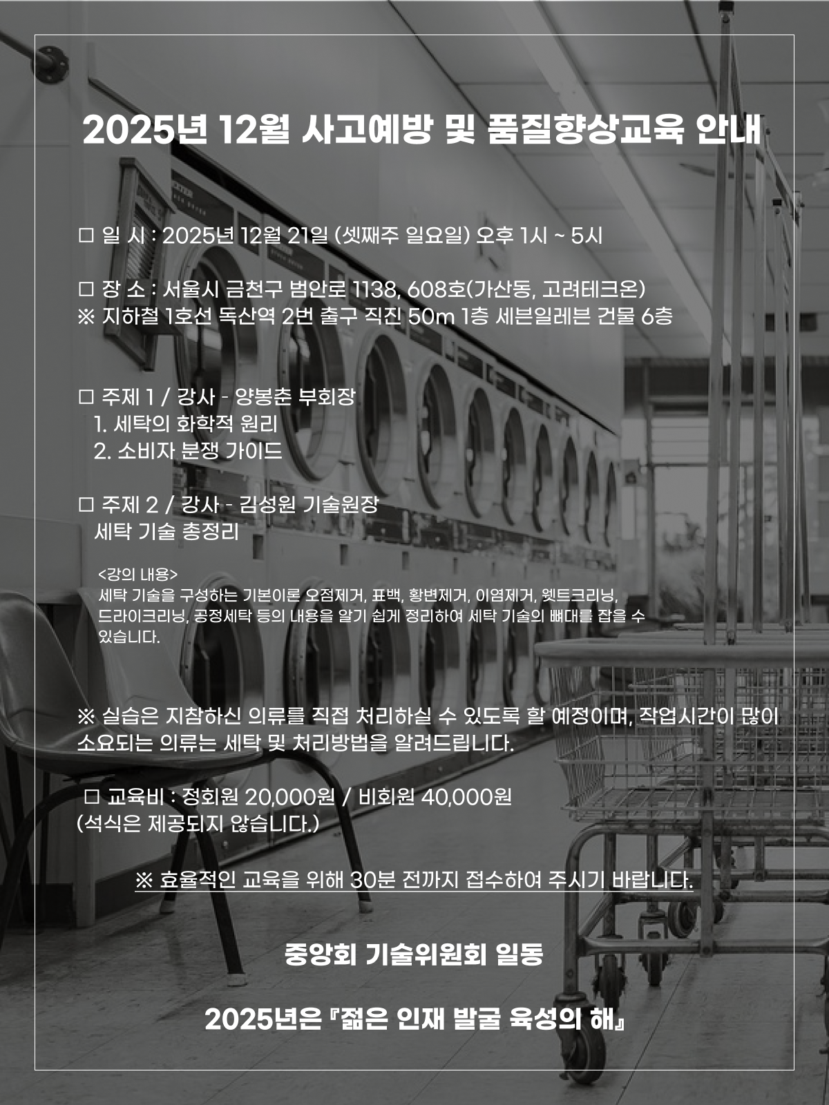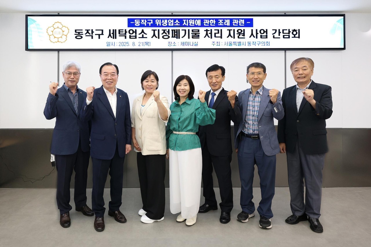 (사)한국세탁업중앙회는 지난 2025년 8월 21일 (목) 오후 3시 민주당 서울시당 을지키는 민생실천 위원회(이하, 을지위원회), 서울시 동작구 구의회(김은하 의원)와 함께 “지자체 관내 소규모 세탁소 지정폐기물 처리 무상지원 사업 확대”를 위한 민관 합동 정책 간담회를 가졌다.